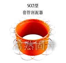 型號502刮泥器主要使用在套管內(nèi)清除殘留水泥漿的作用,一般都是使用細(xì)的鋼絲繩纏繞在鋼圈上而制成的,結(jié)構(gòu)簡單,使用方便,效果顯著。這類產(chǎn)品后續(xù)還設(shè)計了套管強力刮泥器(502-Ⅰ)型和鉆桿刮泥器(502-Ⅱ)型。