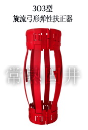 型號303的旋流弓形扶正器符合API10D標準,它的制造工藝與型號300基本相同,不同的是在弓形彈簧鋼片中部固定了一個魚鰭形狀的鋼片,它有改變泥漿流向的作用,使泥漿產生如渦輪一樣的旋流作用,促進泥漿循環(huán)。