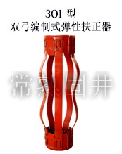 型號301的雙弓編織式(非焊接)彈性扶正器的制造工藝與型號300基本相同,唯一不同的地方是彈簧弓片是雙弓的,它的特點是與井壁的接觸點比型號300多了一倍,使得它的扶正力更大,啟動力更小,能更好的使套管居中。 |