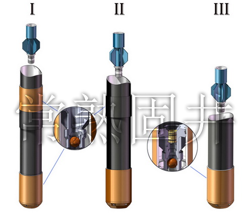 此類設(shè)備還有一種自灌模式的組合,請(qǐng)參閱(組合形式Ⅲ),自灌式的閥內(nèi)有一個(gè)關(guān)閉套,套管下到預(yù)定位置后,通過(guò)插入頭加壓5-10噸壓力將關(guān)閉套推動(dòng),關(guān)閉閥里的流通孔,此時(shí)閥從自灌模式轉(zhuǎn)化為非自灌模式,按照正常的插入式固井方式操作直至固井作業(yè)完成。 |